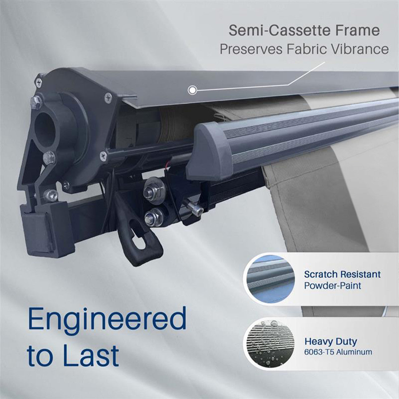 - Semi-cassette frame protects fabric when retracted