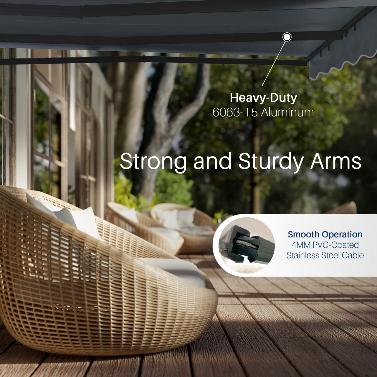 | Kit Includes: | (1) Semi-Cassette Frame; (1) Awning Fabric; (1) Motor; (1) Set of LED Lights; (1) Handle Crank; (1) Remote; (1) Wall-Mounted Remote Holder; (1) Manual; (1) Set of Assembly Hardware |