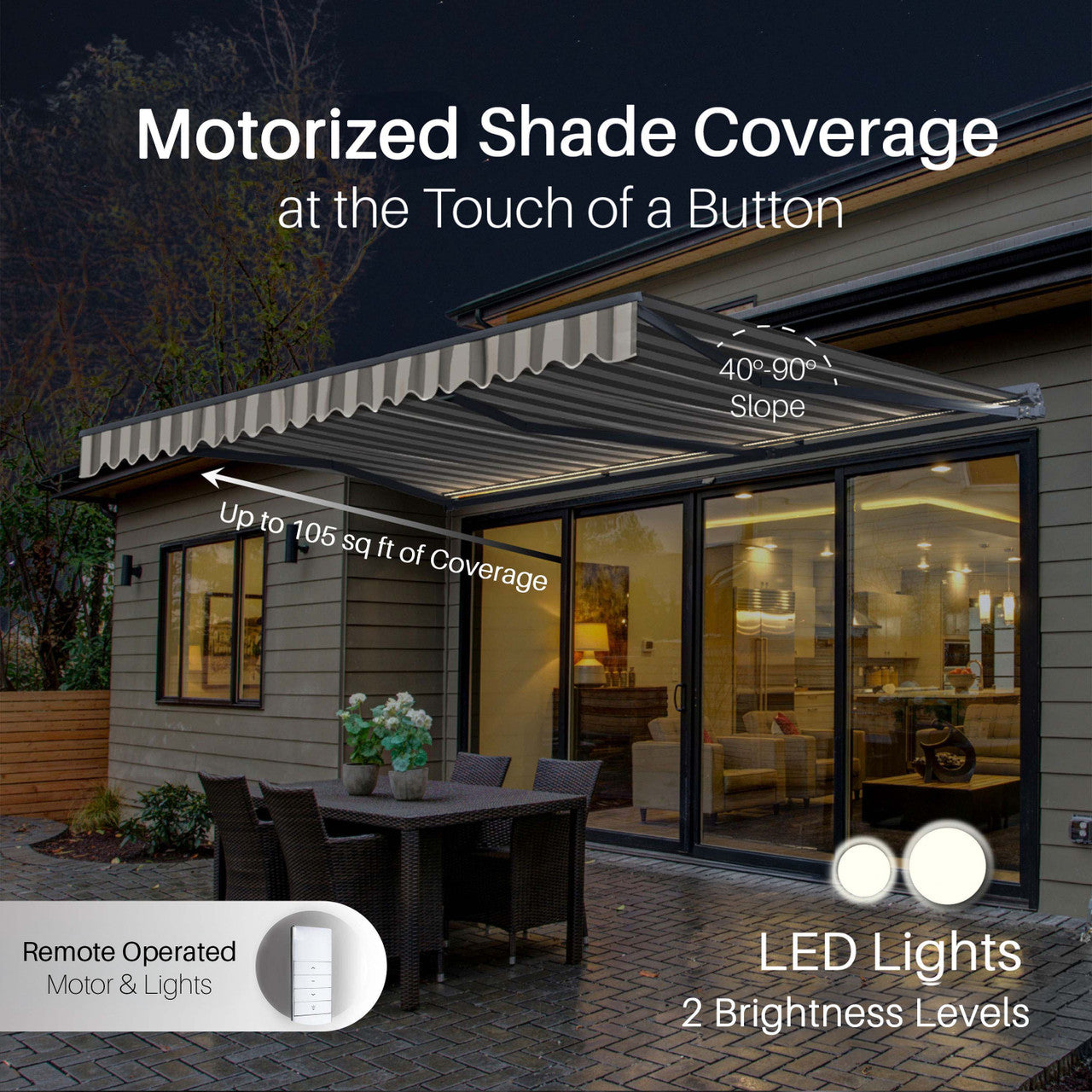 Create a stylish, shaded retreat for relaxing or entertaining with the Moroccan Collection Awning. Its sleek semi-cassette frame protects the fabric when retracted, while built-in LED light strips with two brightness levels set the perfect mood after sunset. Designed for durability, the awning's UV- and water-resistant striped fabric offers reliable protection from the elements—so you can enjoy your outdoor space, day or night.