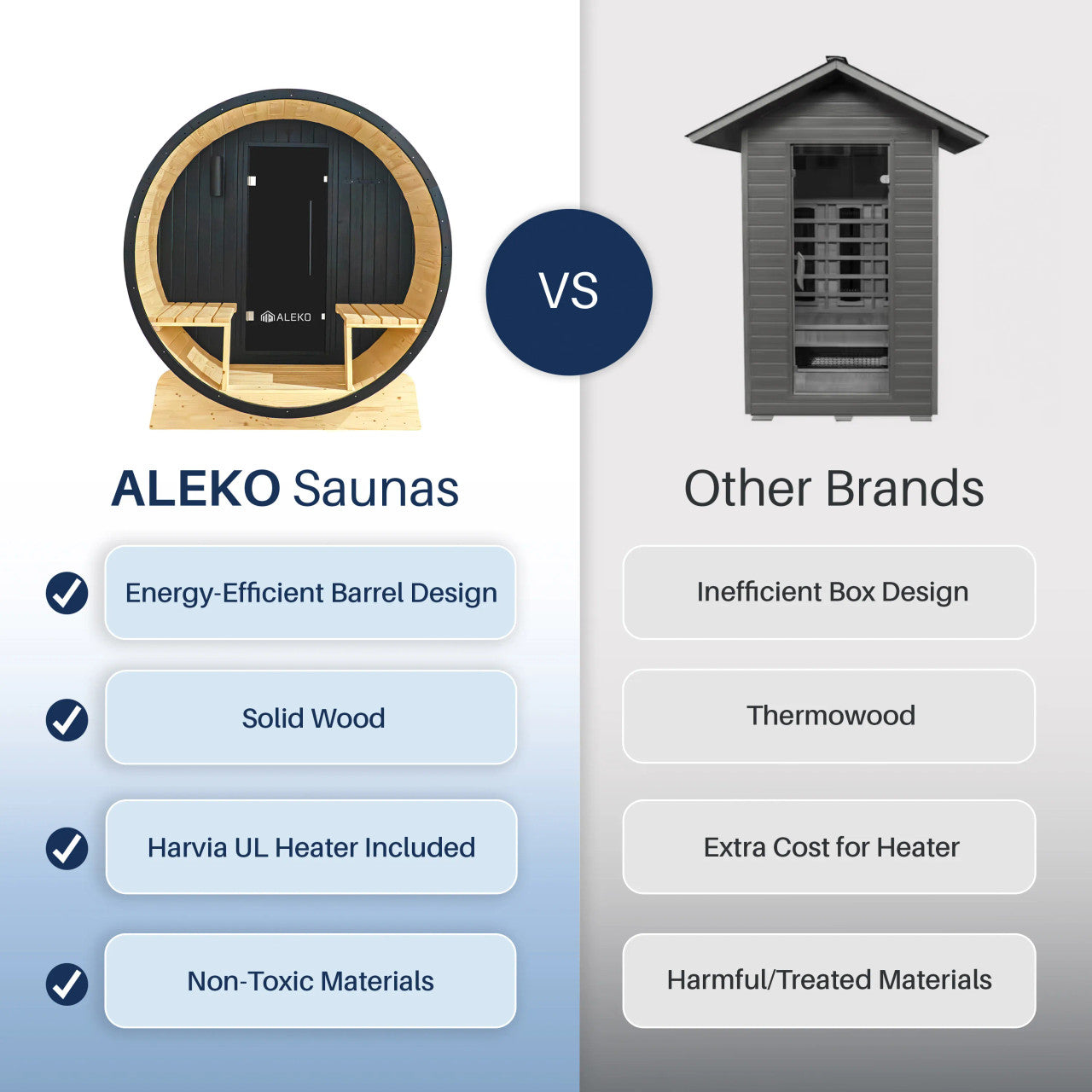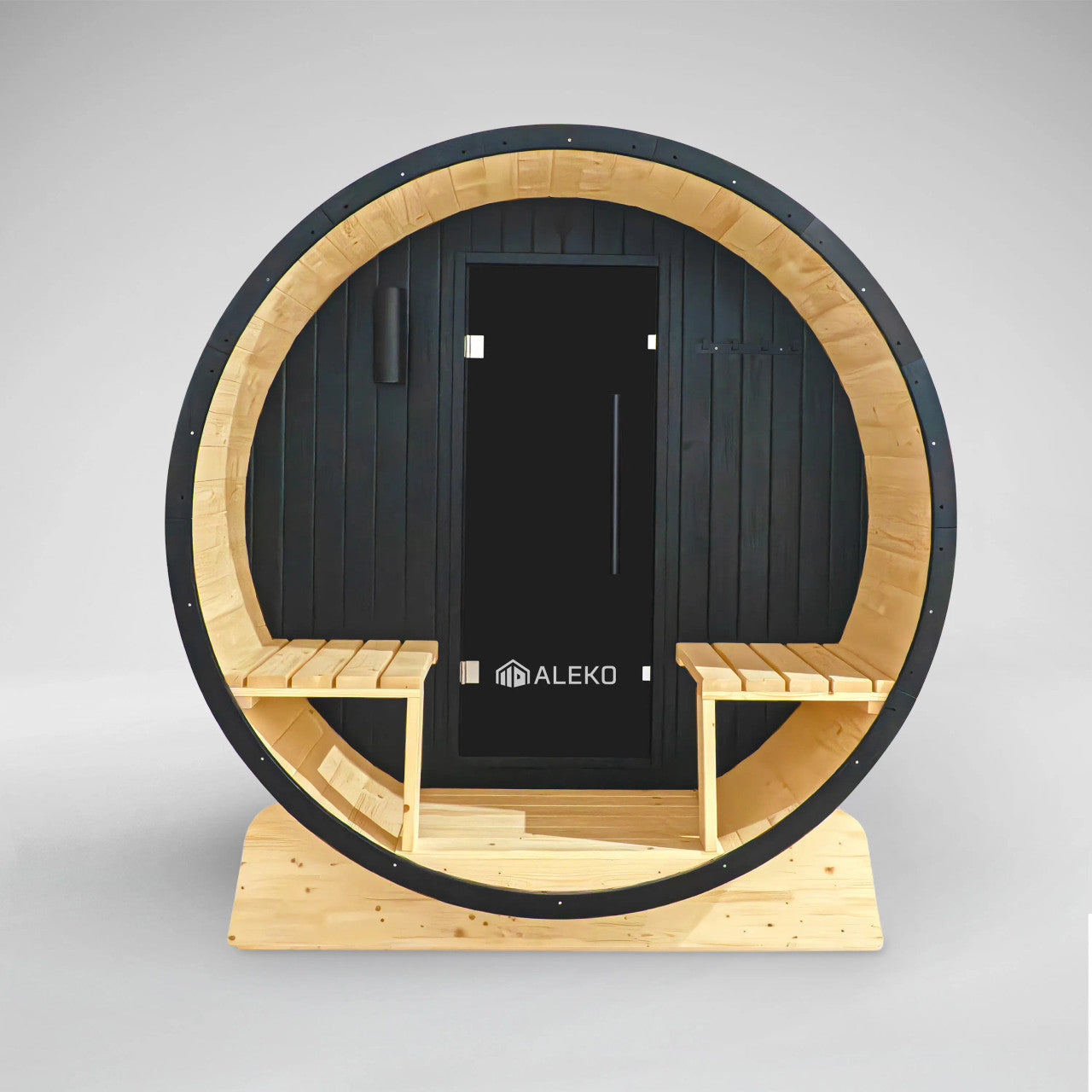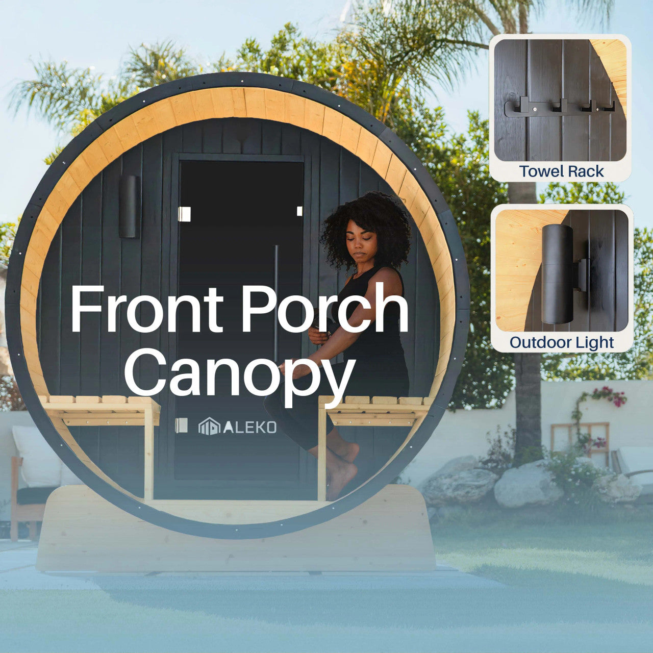 Aleko Anémona White Finland Pine Barrel Sauna with Front Porch Canopy & Black Accents – 6-8 People | SB8PINEBLK-AP