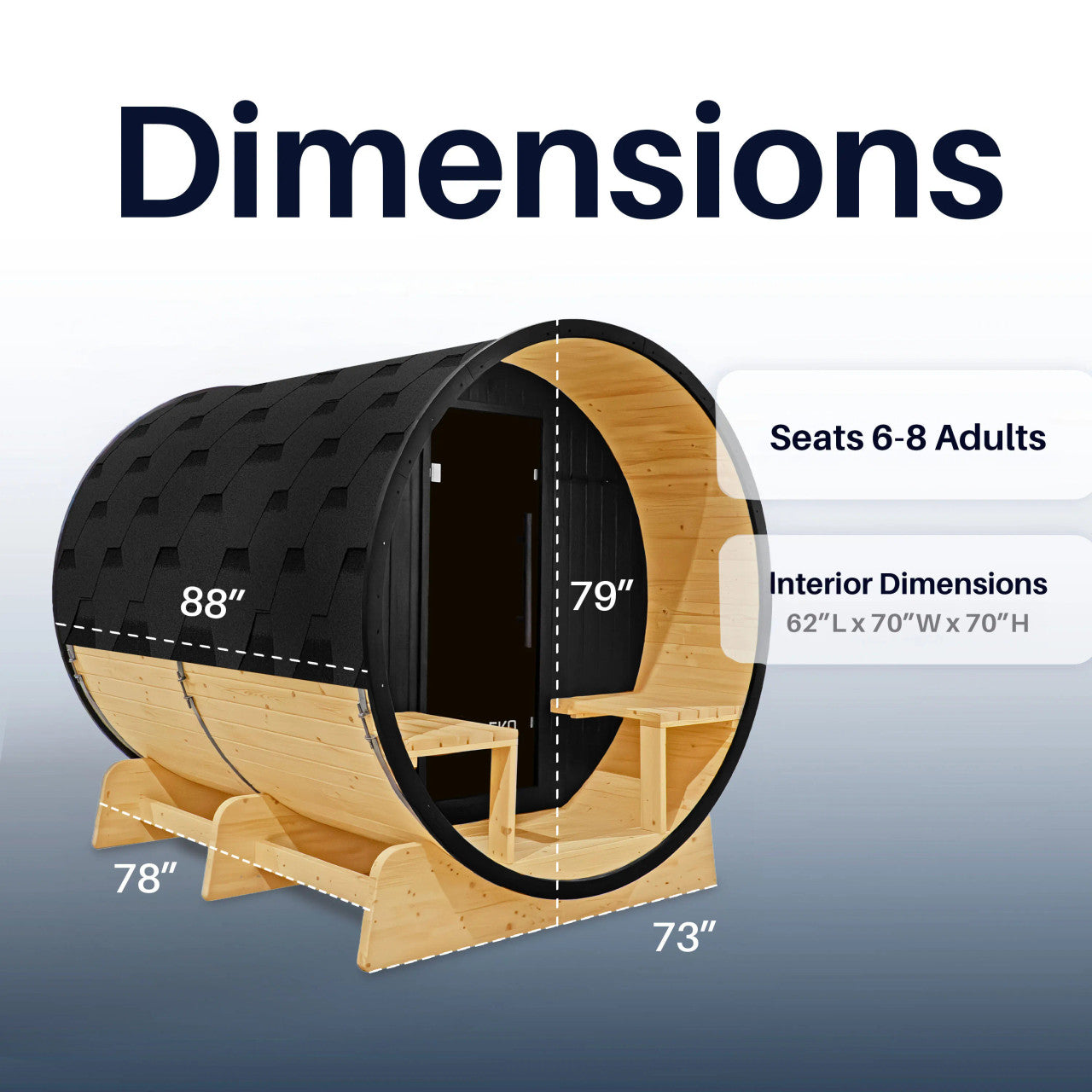The Anémona Barrel Sauna with Black Accents offers the same spacious comfort and timeless design as the original, now with a bold, modern edge. Crafted from premium white pine, its curved barrel shape ensures efficient, even heating. A front porch canopy expands seating and cooling space, while exterior features like an LED lamp, towel rack, and shingle roofing add function. Complete with a Finnish Harvia heater, sauna stones, and accessories for true relaxation.