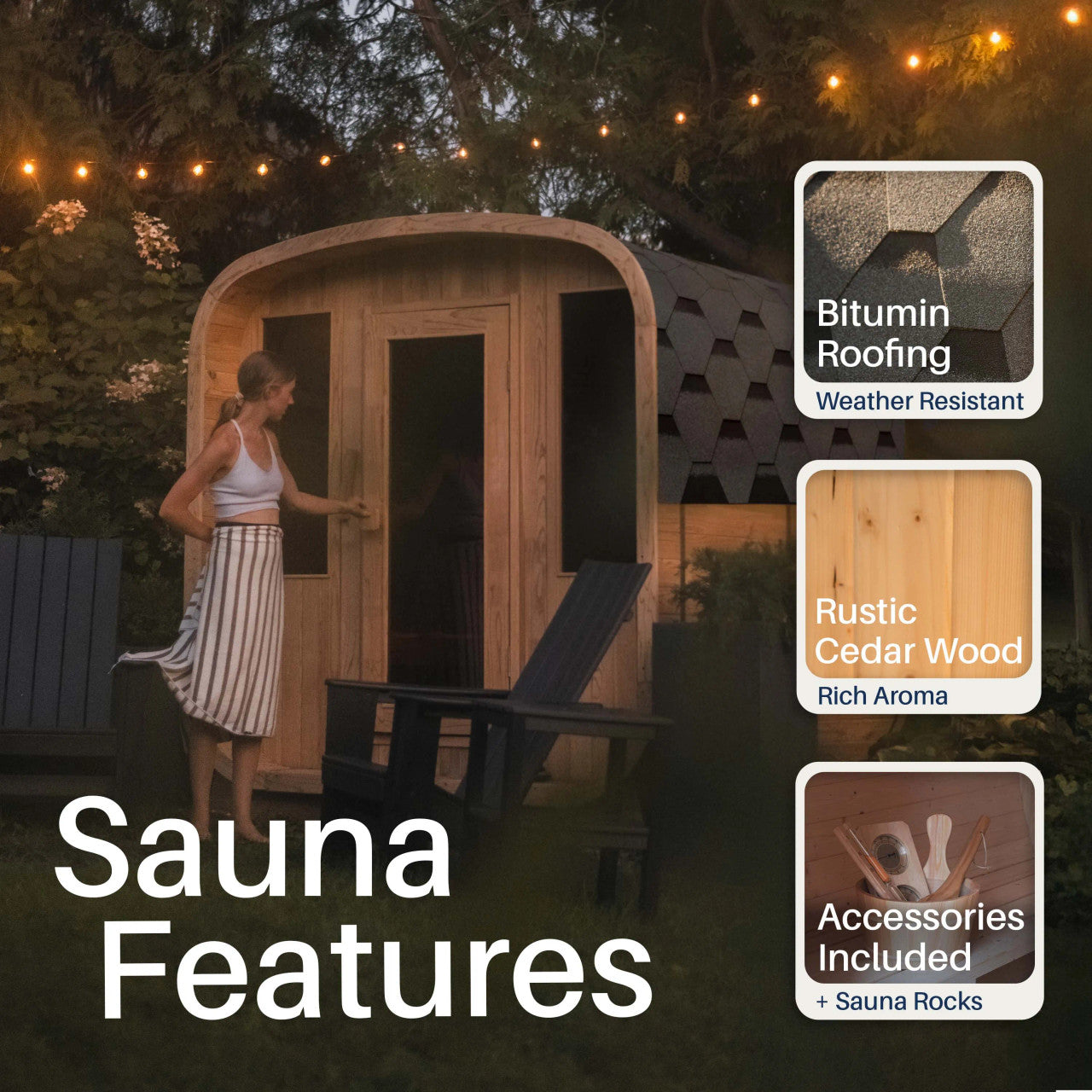 - Sauna stones and accessories included