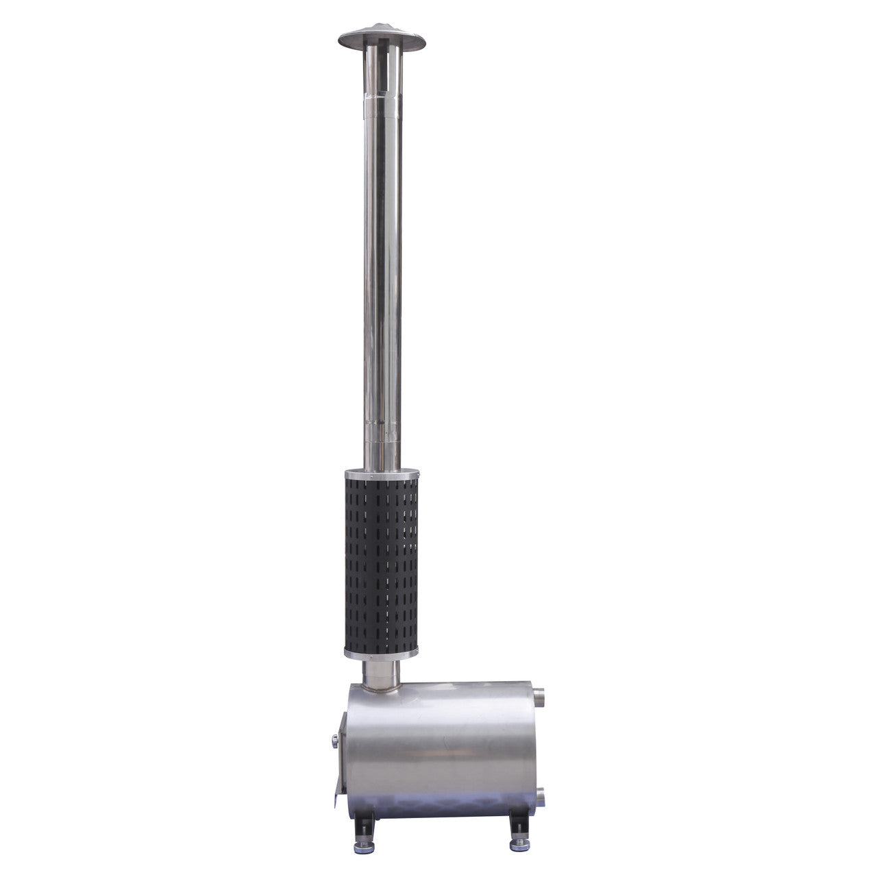 This wood-burning heater is made from stainless steel to prevent rust and corrosion. An iron anti-scald cover is attached to the chimney for safety.